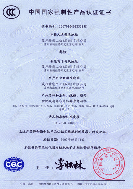 CCC電容運轉減速機證書
